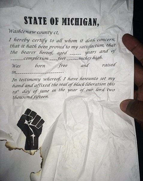 On June 19, in celebration of the freedom we enjoy today and in solidarity against the oppression still present, we took to the streets of Ypsilanti. Blacks who participated held a freedom ceremony where all who were willing signed Freedom Papers, designed to reflect what freed slaves would have to carry if they lived in Washtenaw County. The point was to hand these freedom papers to many black people passing on the sidewalk and in the streets, all the while asking them, “Are you free?” and “Would you like to be?”