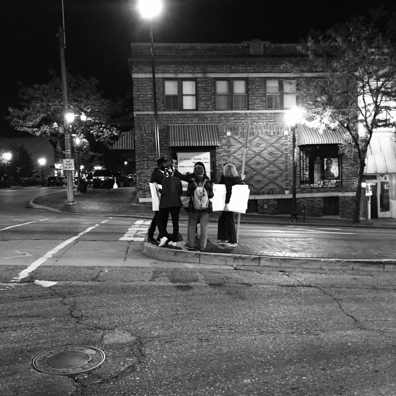 FreedomTuesdayz, Michigan Ave. The sun sets early. The streetlights are surprisingly good, though. D, J, and J on the island between lanes on the east side of the intersection. J, L, and S by city hall, SE corner of Huron and Michigan. Our signs say “Honk If You Don’t Trust Police,” and “Protect Black Life,” and “Justice for Aura Rosser.” D’s drumming and horns honking ring through the night.