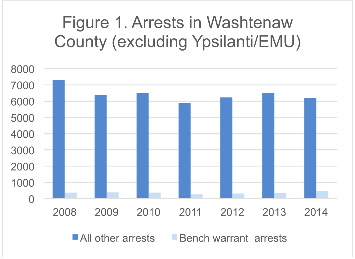 The Michigan Incident Crime Reporting (MICR) database includes detailed arrest data beginning in 2008; the most recent year available is 2014. Figure 1 below charts arrests on bench warrants as compared to all other “underlying” arrests for Washtenaw County, excluding the City of Ypsilanti and excluding arrests by the EMU Police Department. Two features are evident: 1) bench warrant arrests constitute a very small fraction of total arrests and 2) they do not vary greatly from year to year.