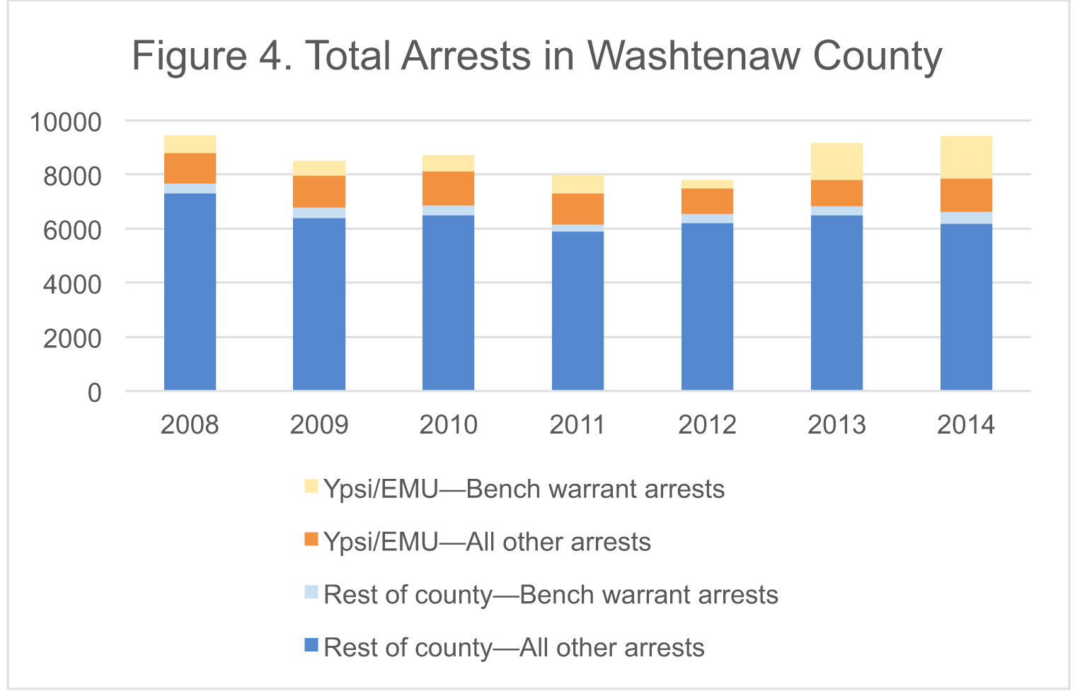 Figure 4 presents the same data as in Figures 1, 2, and 3, combined in a “stacked” chart. Each column in Figure 4 represents the total number of arrests in Washtenaw County. Each color represents a different segment of those arrests, with Ypsilanti/EMU PD’s combined share indicated in orange and the rest of the county in blue. Bench warrant arrests are the light orange segment at the top. In 2013 and 2014, bench warrant arrests for Ypsilanti/EMU PD alone represented a significant proportion of the county’s total arrests: 1,583 out of 9,044, or 17.5%.