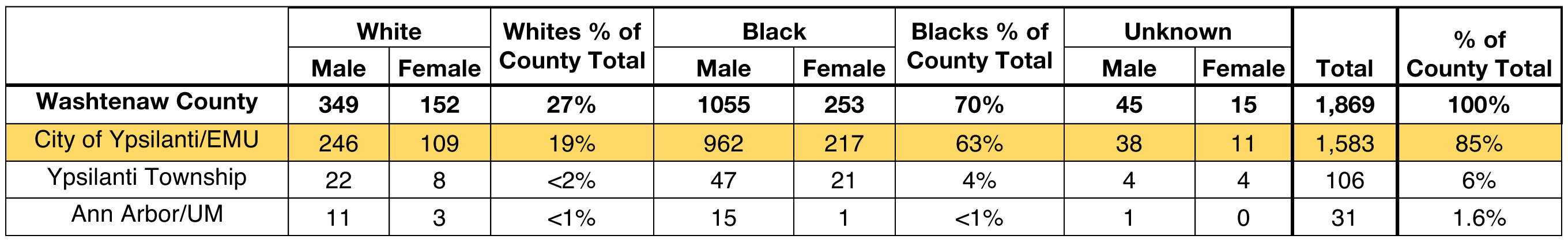 How do arrests on bench warrants in Ypsilanti compare to other municipalities in Washtenaw County? In contrast to the City of Ypsilanti, Blacks in Ypsilanti Charter Township made up less than 4% of the county total arrests on bench warrants, and Black residents constitute an estimated 5% of the county population. In other words, Blacks in Ypsilanti Township experience bench warrant arrests in proportions similar to their numbers in the county. In the entire city of Ann Arbor, only 16 Blacks were arrested on bench warrants, for 0.8% of the county total. The grand total of 31 arrests on bench warrants for Ann Arbor constitutes 1.6% of the county total, despite the fact that Ann Arbor makes up 33% of the county’s population.