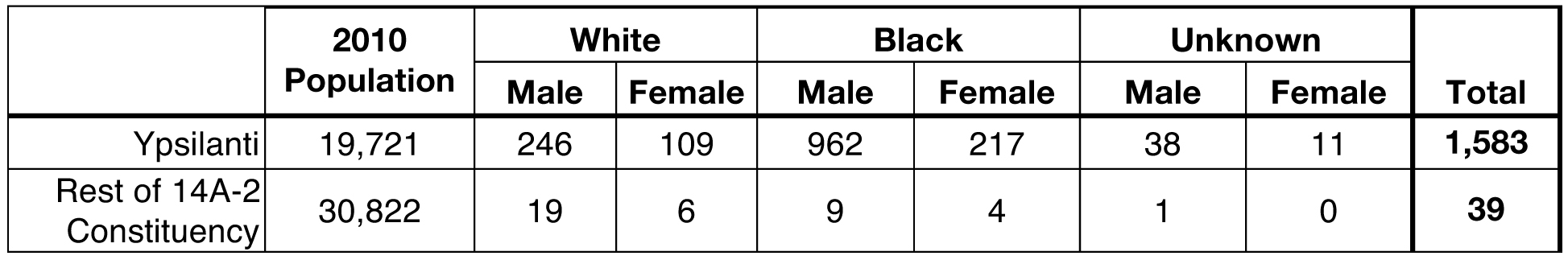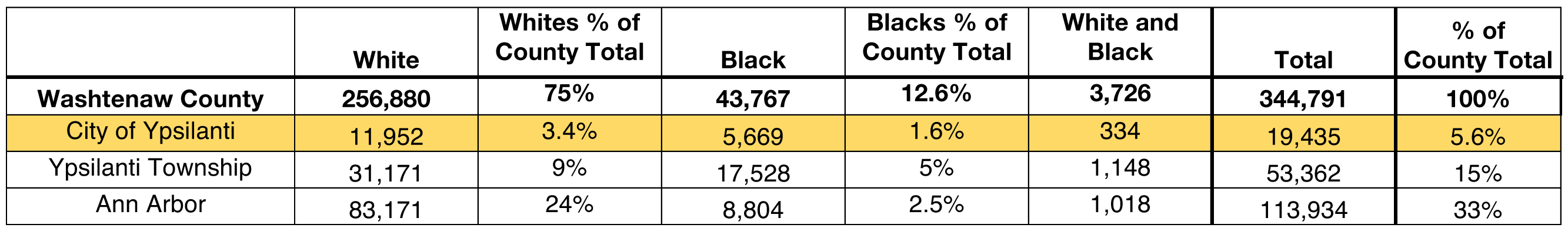 [2] U.S. Census Bureau, 2010 Census, Demographic Profiles for Michigan. Ypsilanti City population, Blacks (one race): 5,669. Total Washtenaw County population: 344,791.