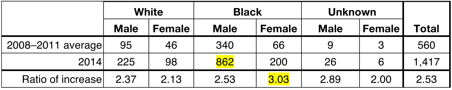 Data indicate that rates of arrest at least doubled for all race categories and on average bench warrant arrests in 2014 were two-and-a-half times the average for 2008 through 2011. However, the increase was lower for white men and women and highest for Black women. There were three times as many arrests of Black women on bench warrants in 2014 than the average for 2008–2011. In absolute numbers of arrests, Black men have been most affected, with an increase from 340 (average) to 862 arrests per year—an increase of 522 arrests. The disturbing trend in bench warrant arrests has disproportionately affected Black men and women.