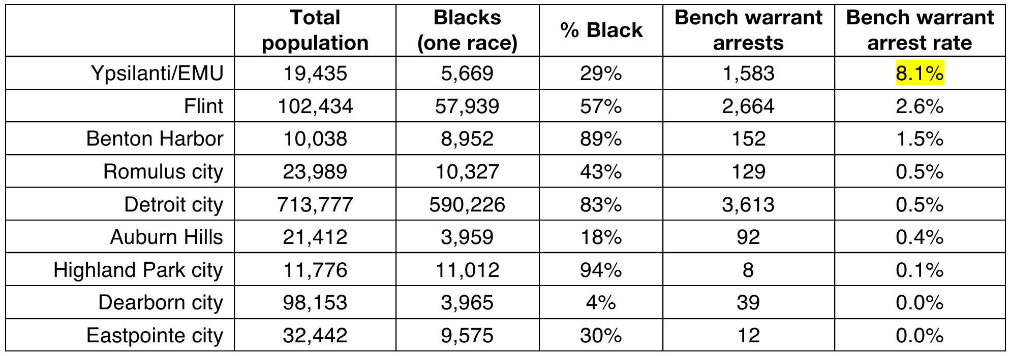Table 4 lists a number of Michigan cities by bench warrant arrest rate per total population. Number and percentage of Black residents is indicated for demographic comparison with Ypsilanti. Ypsilanti’s rate of bench warrant arrests is more than three times greater than the city with the next highest rate, Flint.