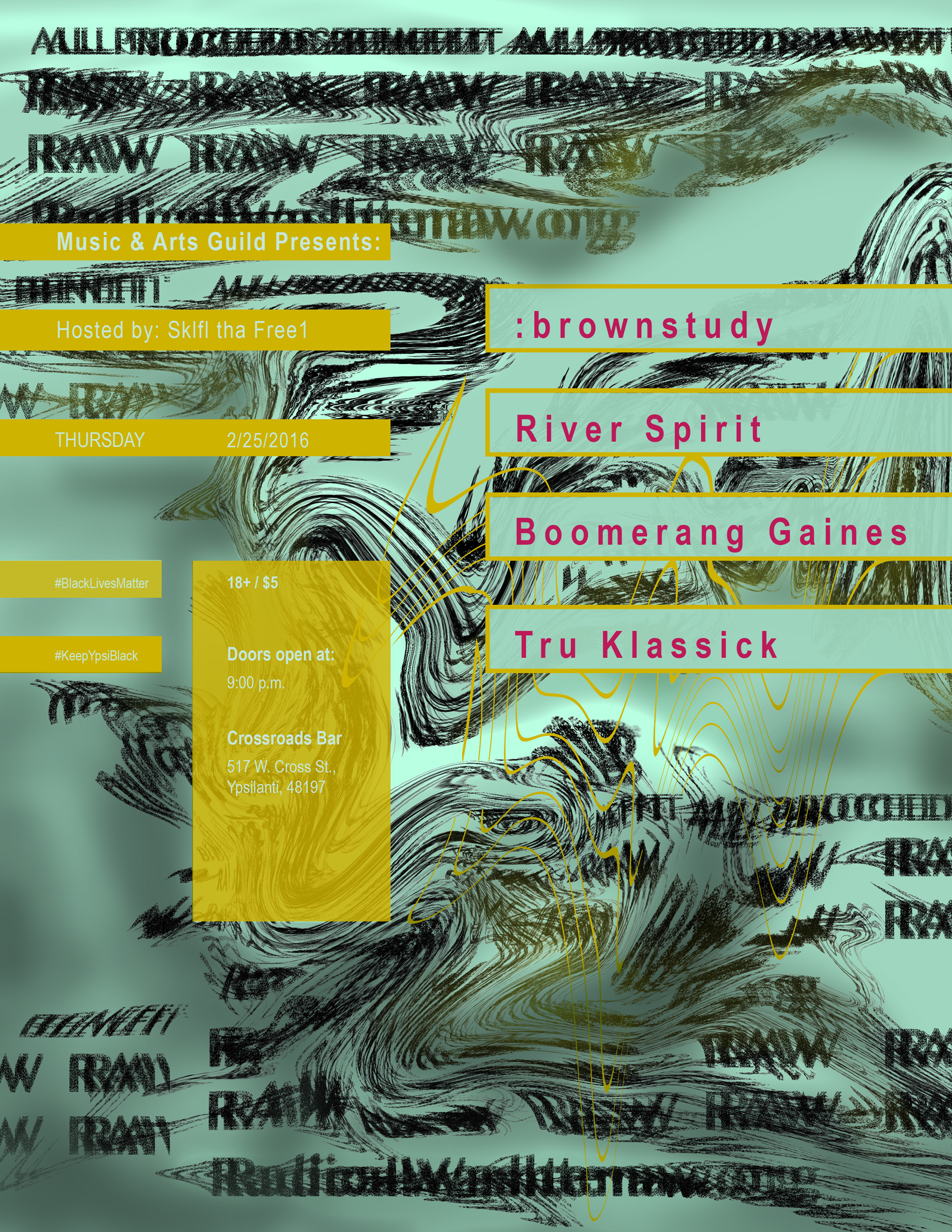 02/13/2016 :brownstudy, River Spirit, Boomerang Gaines, Tru Klassick Poster design by Taylor Stewart Share this: Click to share on X (Opens in new window) X Click to share on Facebook (Opens in new window) Facebook