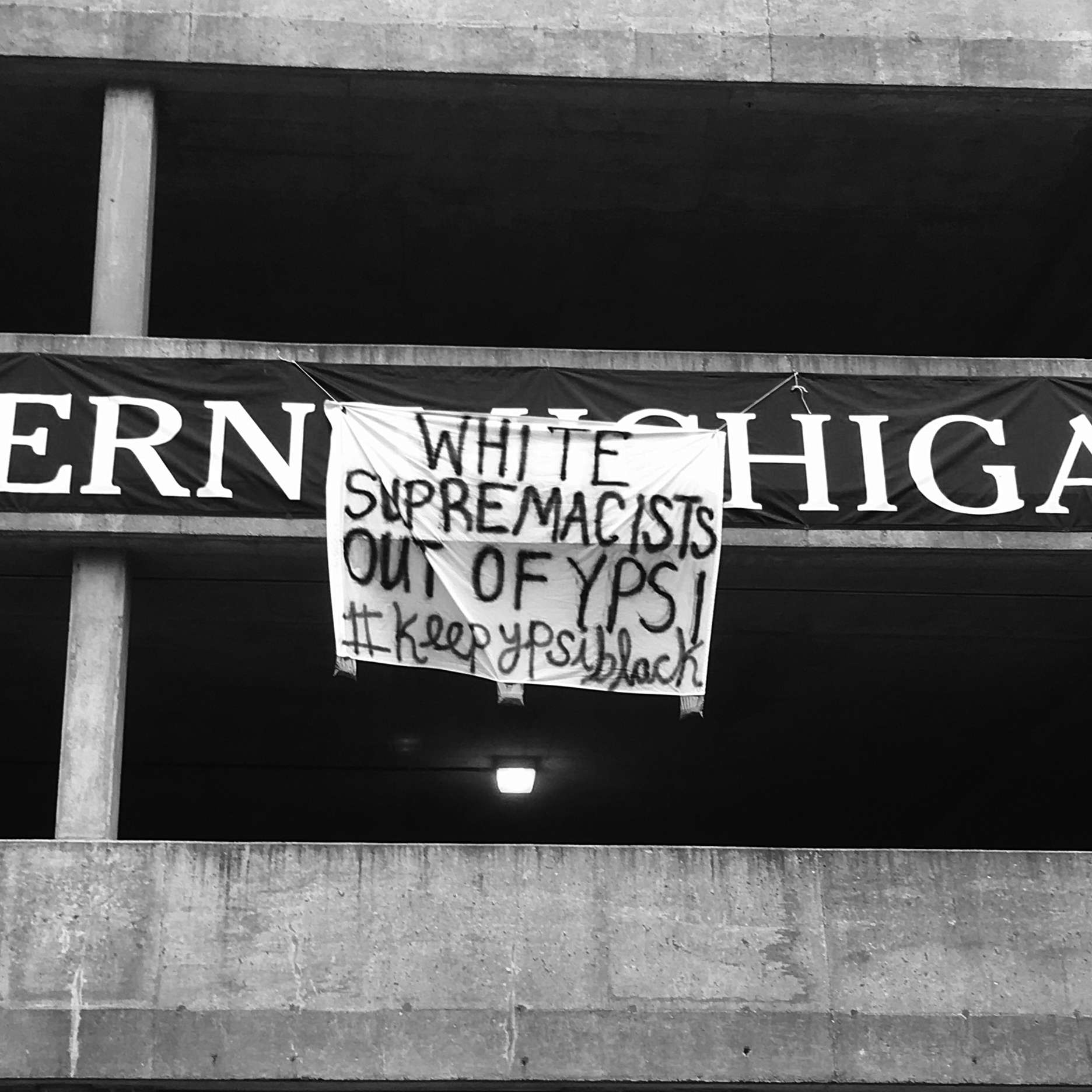 Today a banner was hung at EMU in response to the despicable graffiti found on campus Tuesday morning and as an act of solidarity with black students at EMU and the Black Lives Matter movement. It is not PoC who should be made to feel unsafe in Ypsilanti but the white supremacist, kkk members and sympathizers responsible for the graffiti and their friends who believe their desire to move through a particular intersection at a given time takes (violent) precedence over the collective need to gather in response to a racialized threat. If Eastern Michigan University and the city of Ypsilanti have fostered an environment where anyone feels safe writing racial slurs on walls, then we have failed as a community. Right now one message rings loud and clear: that black lives are less important than white lives, less important than a drive home from work to White Safety. But other voices also ring: voices that say black lives matter, that say #keepypsiblack, and we all need to add our voices, too. If any message should resound in our streets, should drip from the walls of the University, or blow in the breeze by the student center, it is this: that white supremacy has no place in our city and those that seek to uphold it should feel afraid.